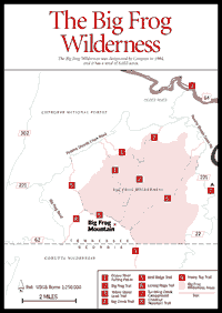 Big Frog Wilderness The Cohutta Wilderness extends into Tennessee as far as the Eastern Continental Divide. Protruding from it is the isolated hulk of Big Frog Mountain [Fig. 15]. Big Frog is not a high mountain (4,224 feet), but, like Grassy Mountain (3,692 feet) in the Cohuttas, it appears more dominant because it stands alone. Lacking the protection of other mountains, it receives the full impact of cold fronts and other climatic events. In addition, it receives high rainfall. Big Frog is a scenic mountain. The top is forested; northern hardwoods are present, as is a boulderfield on the north side. Big Frog was designated a wilderness by Congress in 1984 and expanded in 1986. It totals 8,055 acres, 83 of which are in Georgia.