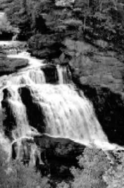 Bridal Veil Falls [Fig. 32(22), Fig 34 (11)], just 2.5 miles west of Highlands, is a gentle beauty. In Cherokee lore, a maiden who walks under the falls in the spring will be married before the turning of the year. An old section of highway routed beneath the falls provides a unique opportunity to drive under the flowing water. The 120-foot falls sometimes displays a rainbow in the afternoon, and it has been known to freeze during the winter.