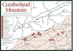 Fifty miles of well-maintained hiking trails provide the best opportunity to become familiar with Cumberland Mountain. These trails range from short, paved paths accessing overlooks to rugged climbs over sandstone boulders as big as houses. Skylight Cave [Fig. 7(13)], Sand Cave [Fig. 6(2)], and White Rocks [Fig. 6(4), Fig. 7(4)] are accessible by trail spurs off the main Ridge Trail [Fig. 7(10)].